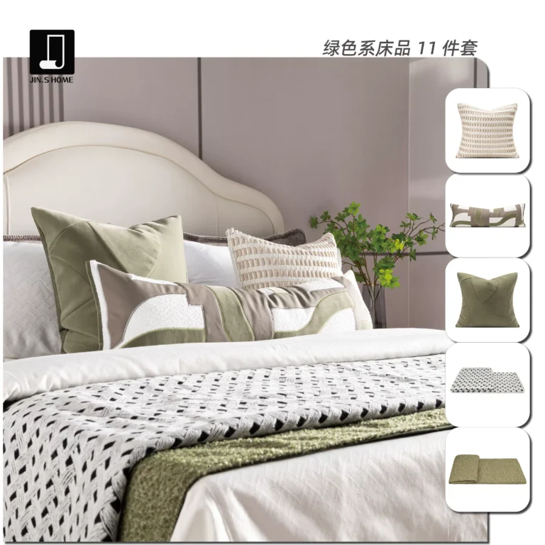 11-piece Wabi-Sabi-style bedding set in green – patterned bedding for showrooms, vacation rentals, and villas – high-quality multi-piece sets