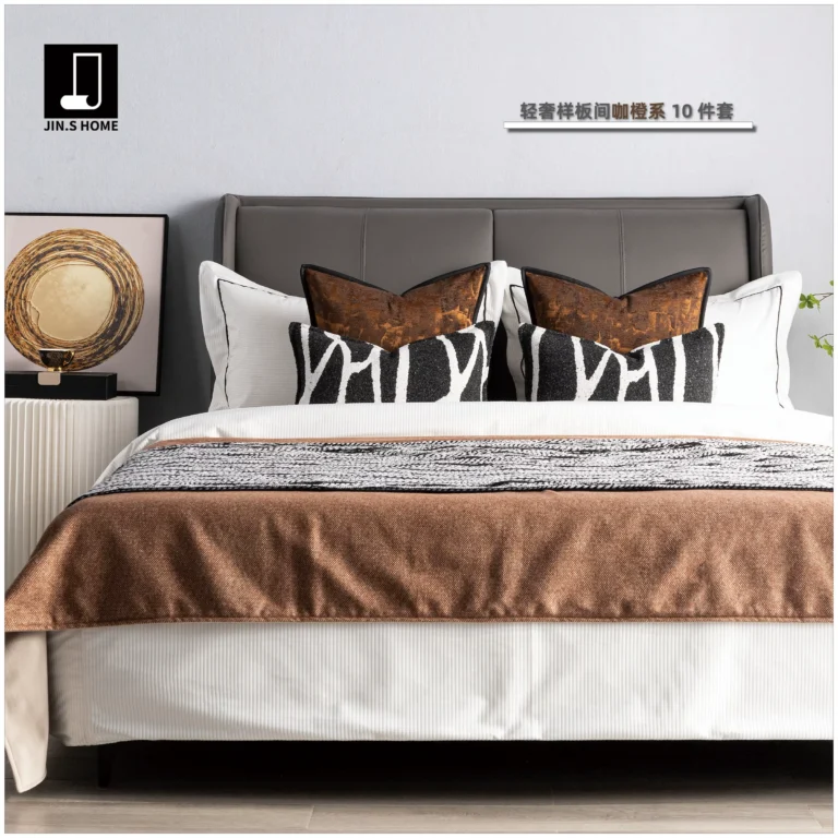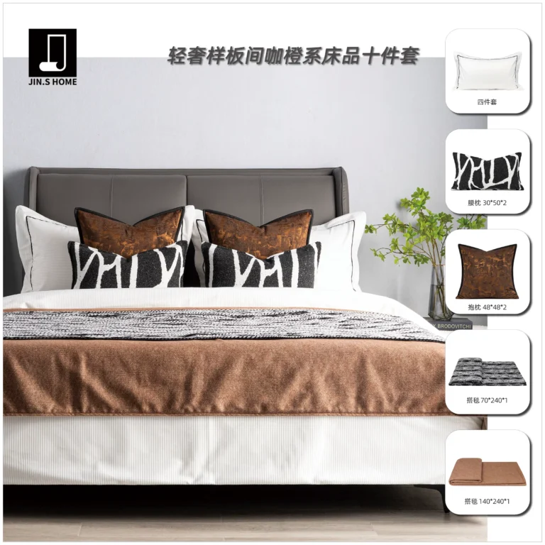 Modern Luxury-Chic Soft Furnishings Showroom: 10-Piece Bedding Set in Coffee and Orange Tones; 4-Piece Bedding Set for Hotel Furniture Showroom