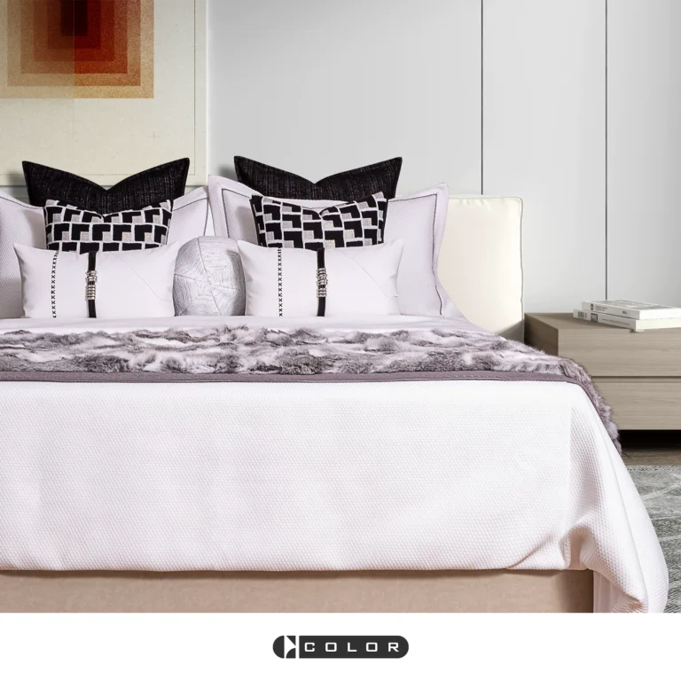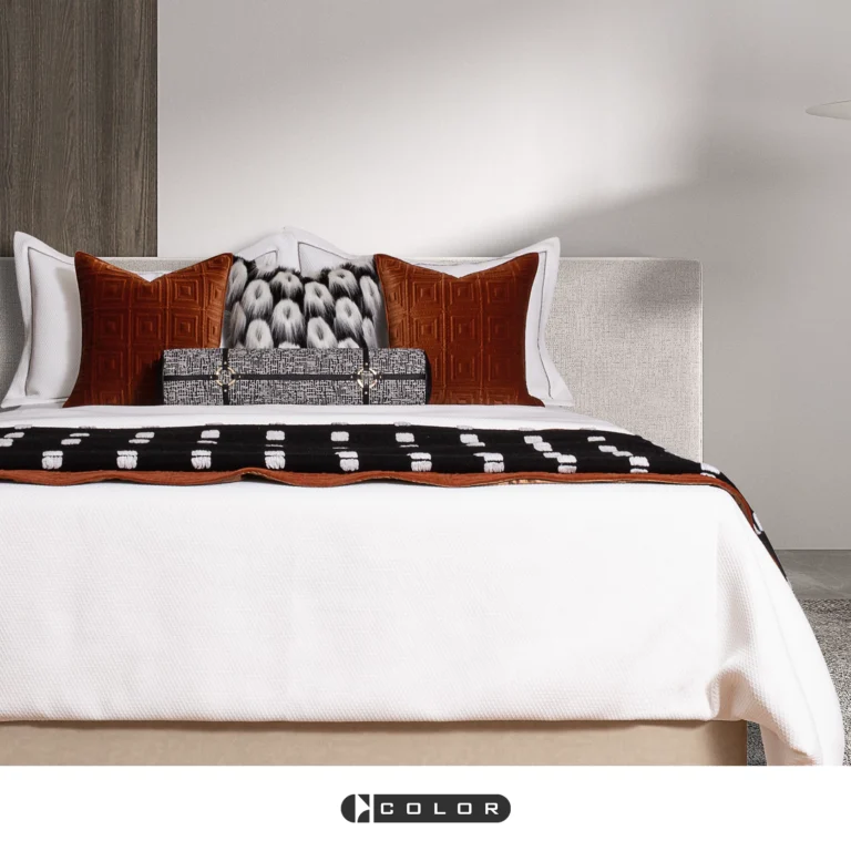 Soft Furnishings for Model Homes: Luxury 4-Piece Bedding Set in Nordic Black, White, and Brown with Gold Accents and Tasseled Pillows