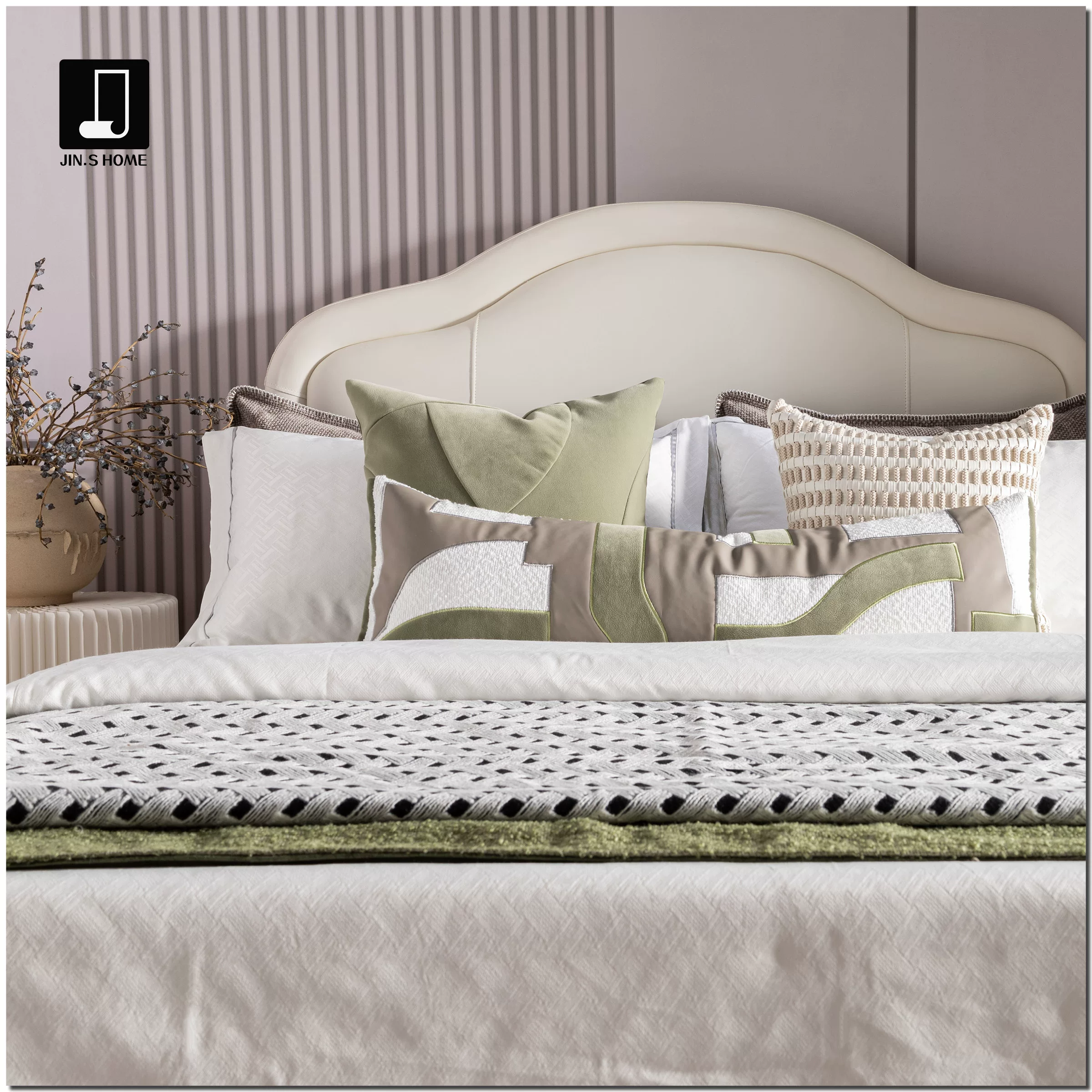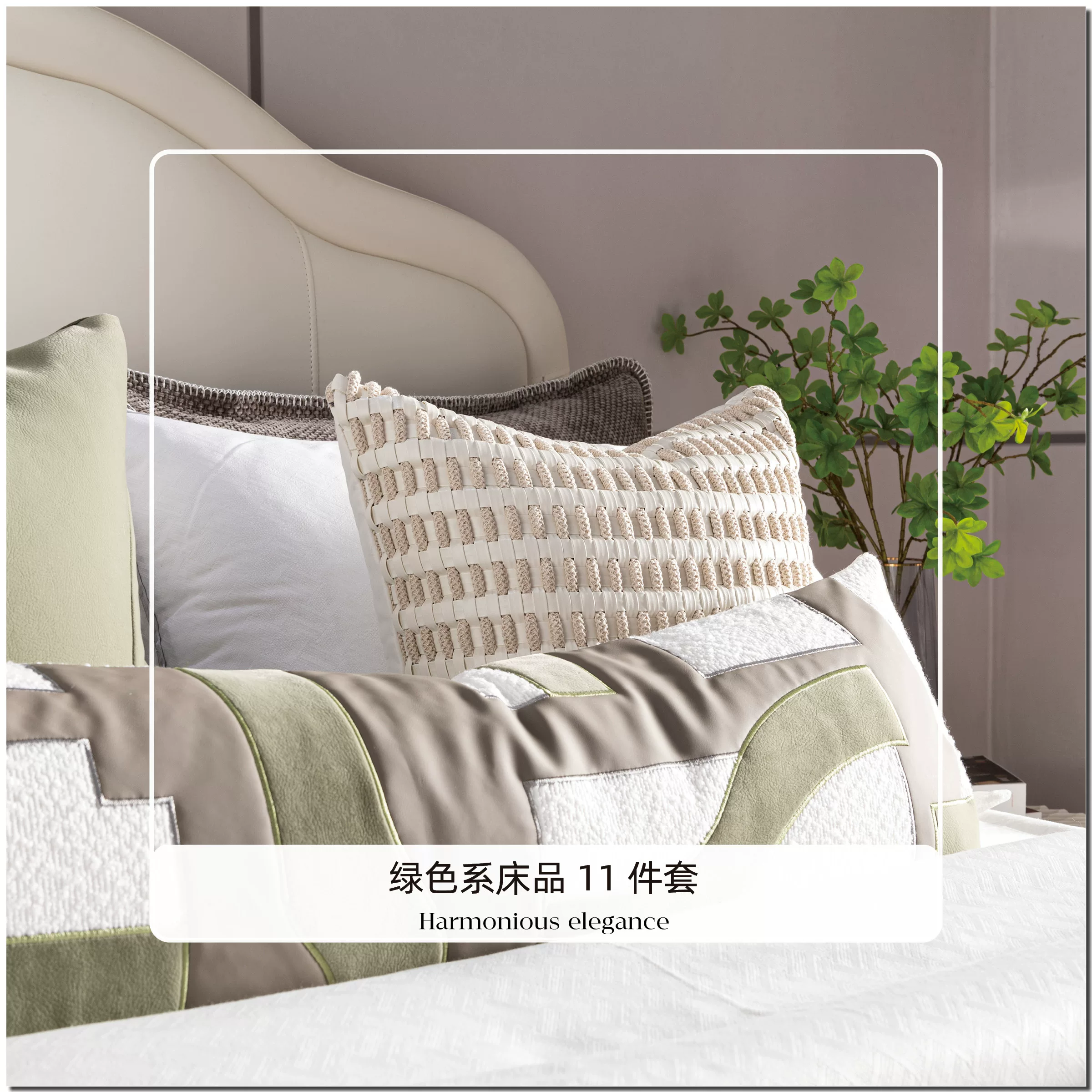 11-Piece Green Bedding Set in a Wabi-Sabi Style for Showrooms, Bed and Breakfasts, Villas, and High-End Display Spaces