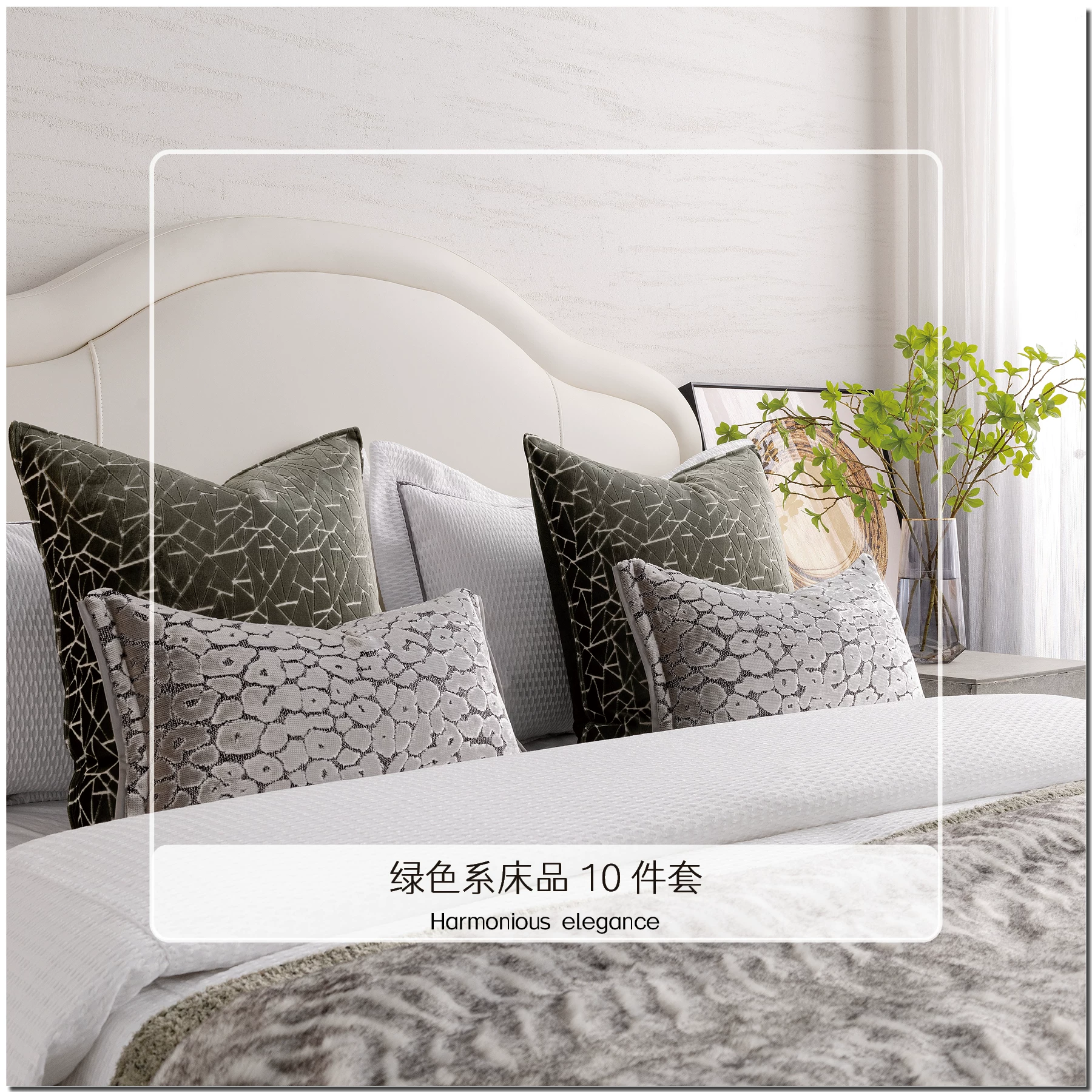 11-Piece Green Bedding Set in a Wabi-Sabi Style for Showrooms, Bed and Breakfasts, Villas, and High-End Display Spaces