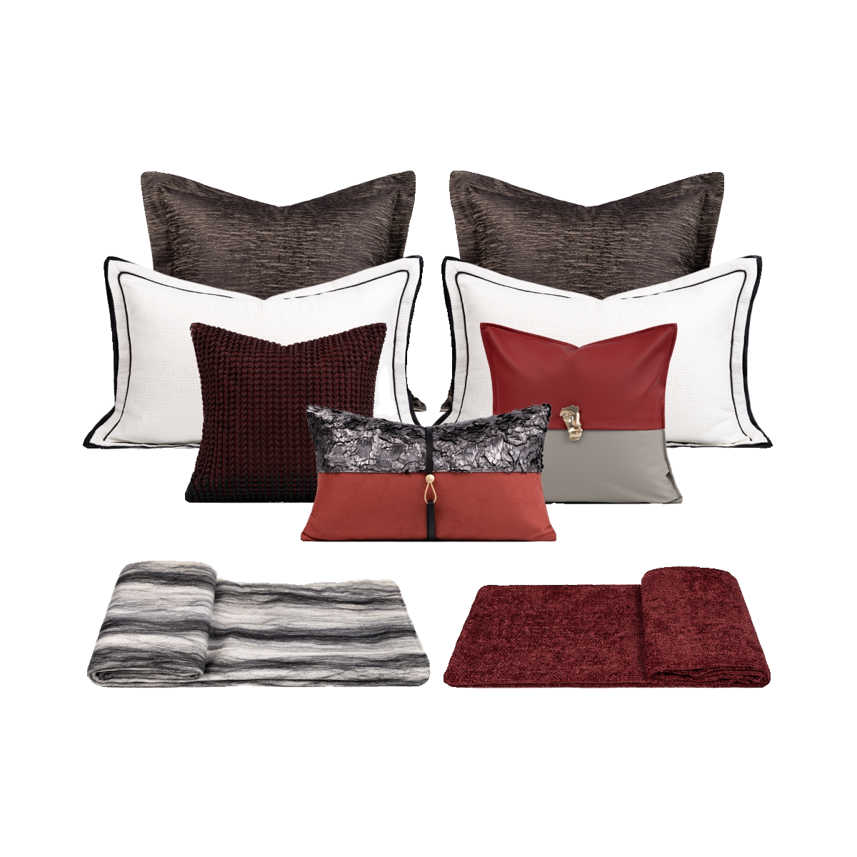 11-Piece Red Bedding Set for Soft Furnishing Showrooms: Modern, Light Luxury, High-End Wood-Grain Textured Bedding Set
