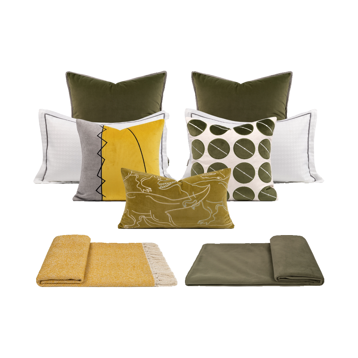 11-Piece Yellow-Green Children’s Bedroom Bedding Set for Soft Furnishing Showrooms: Dinosaur Embroidery and Polka Dot Pattern, Multiple Sets Available