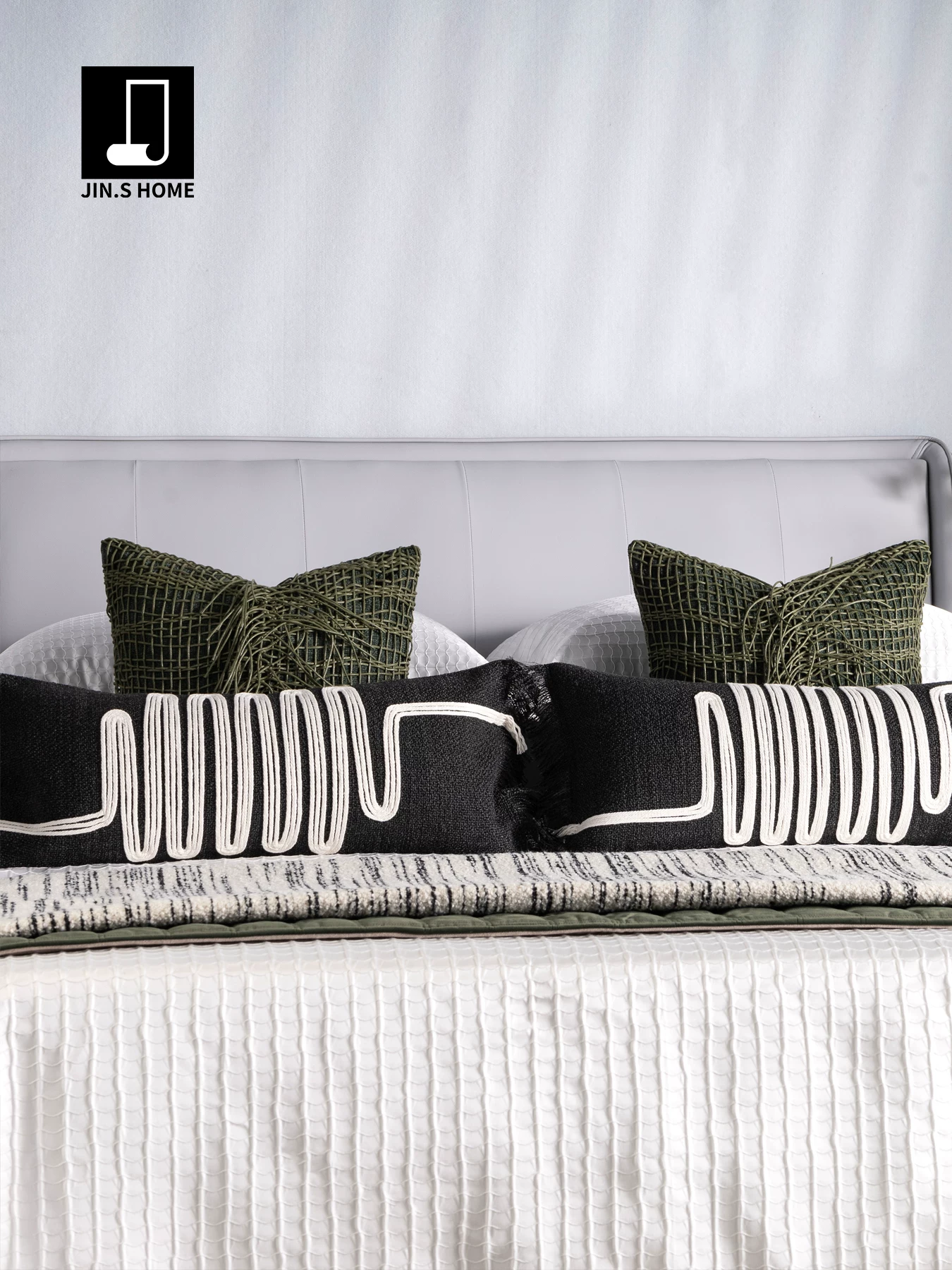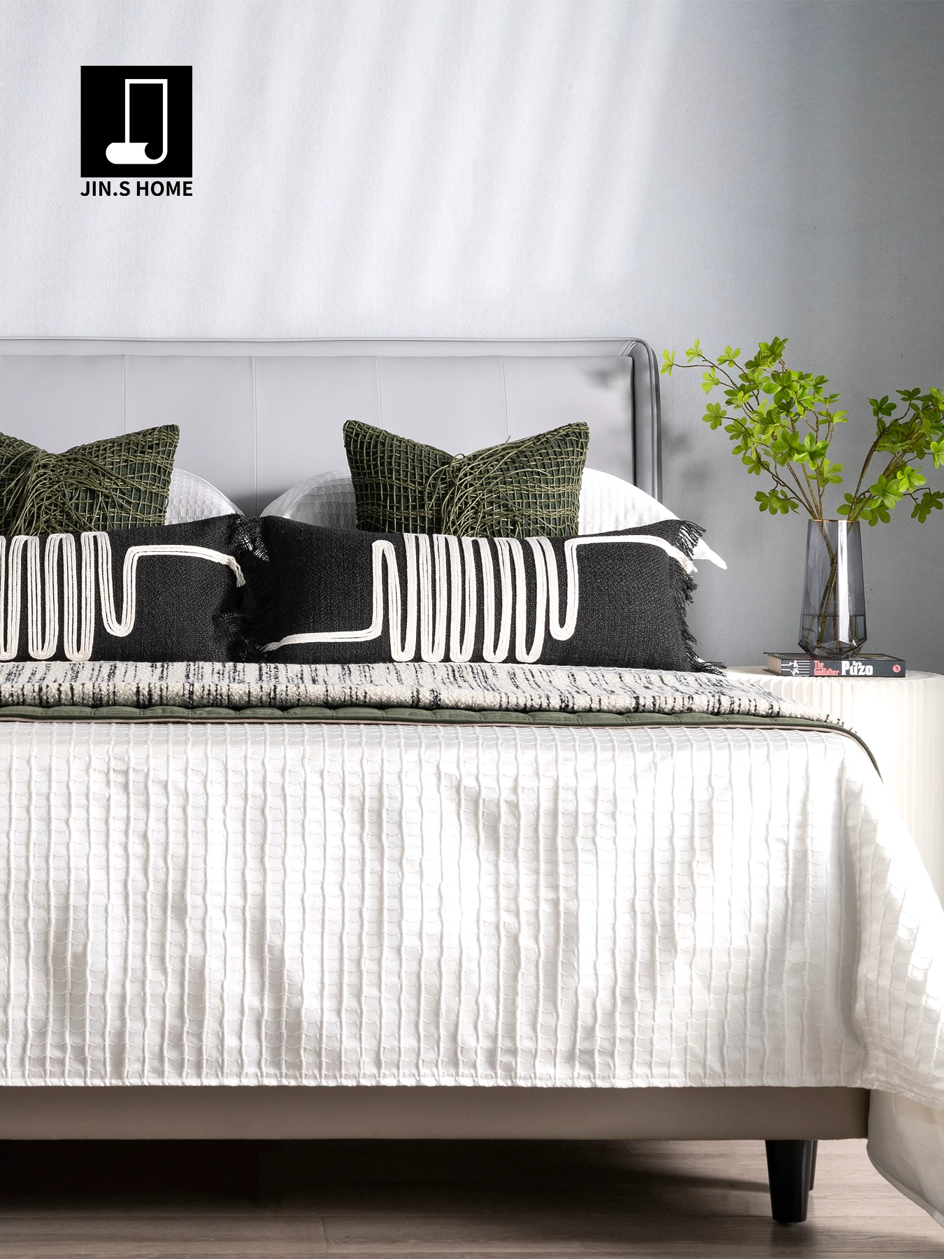 Soft Furnishings for Model Homes: Light Luxury High-End 4-Piece Bedding Set with Green Woven Fabric, Leather, and Horn Buttons