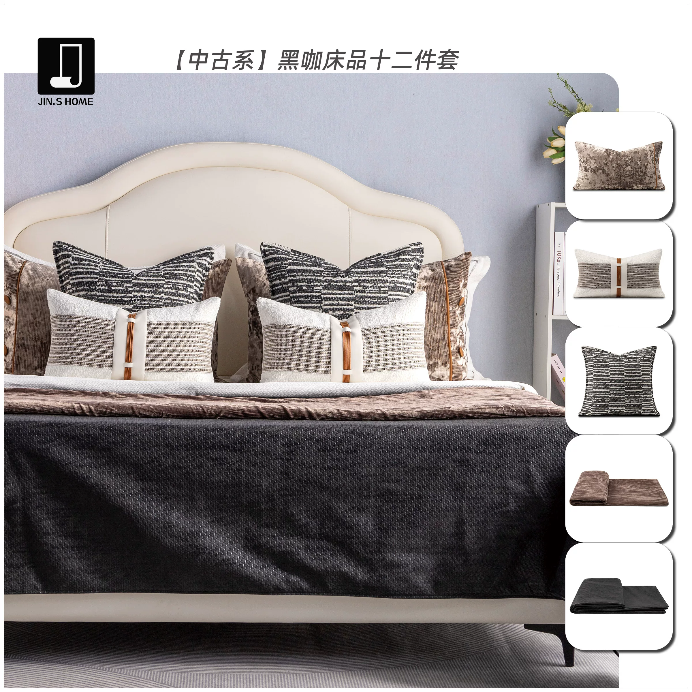 Brocade-Style Vintage Black and Brown 12-Piece Bedding Set for Model Homes, B&Bs, Villas, and Showrooms—High-End Multi-Piece Set