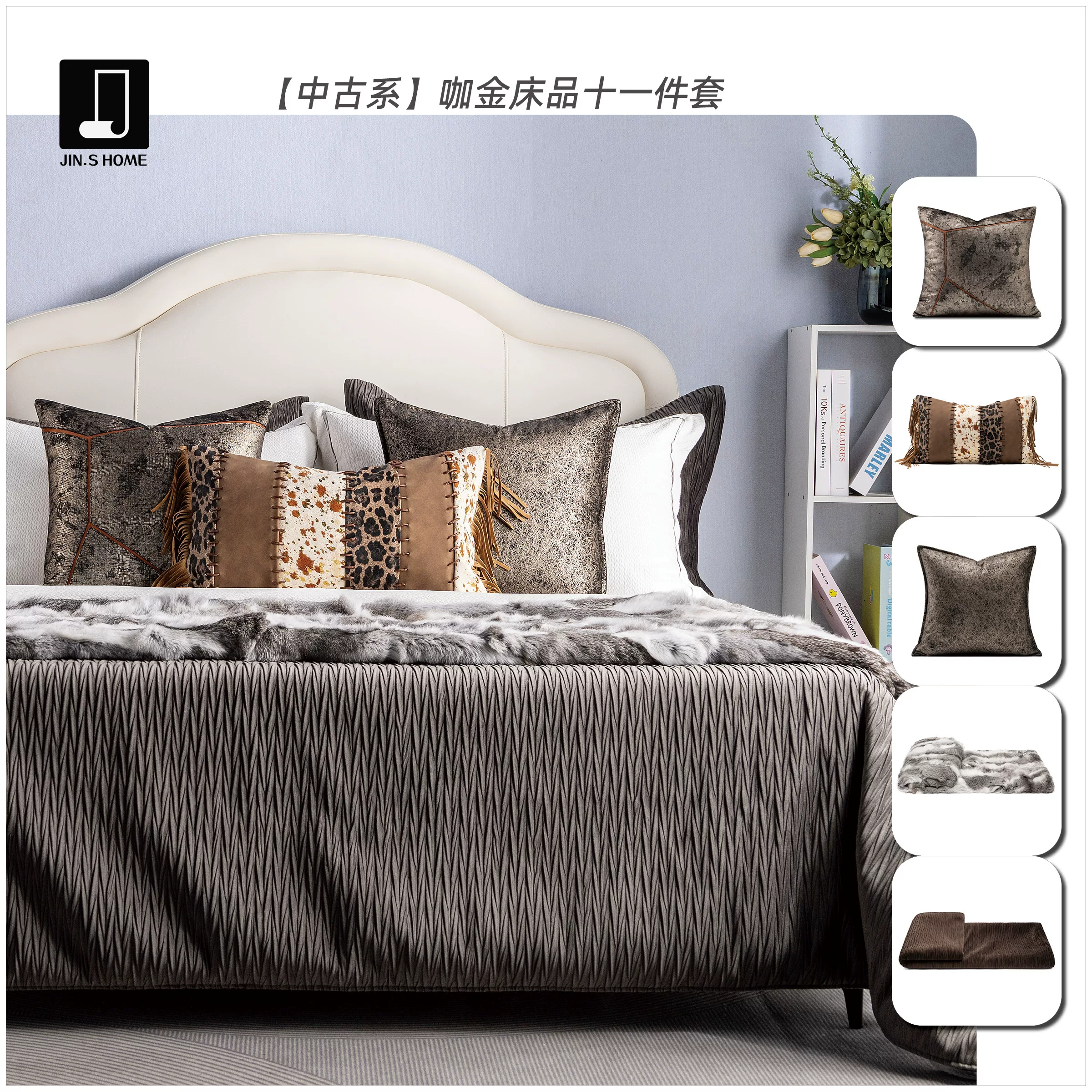 Brocade-Style Vintage-Inspired Coffee-Gold Bedding 11-Piece Set: Model Room, B&B, Villa, Showroom, High-End Multi-Piece Set