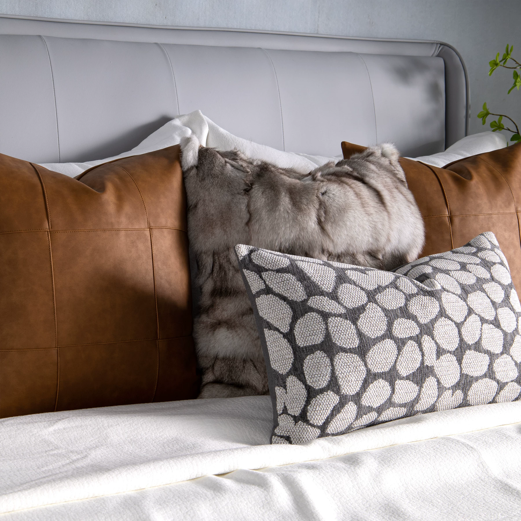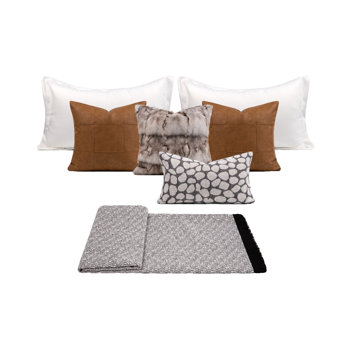 Interior Design Showroom: 9-Piece Brown Bedding Set with Fox Fur Pillows, Brown Leather Patchwork, and Shaggy Throw Blanket