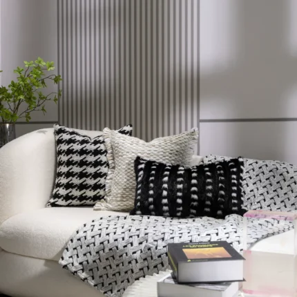 Interior Design Showroom: Minimalist, Modern, and Luxe Living Room Sofa Cushions—Black-and-White Houndstooth Pattern Genuine Mink Fur Cushion Set