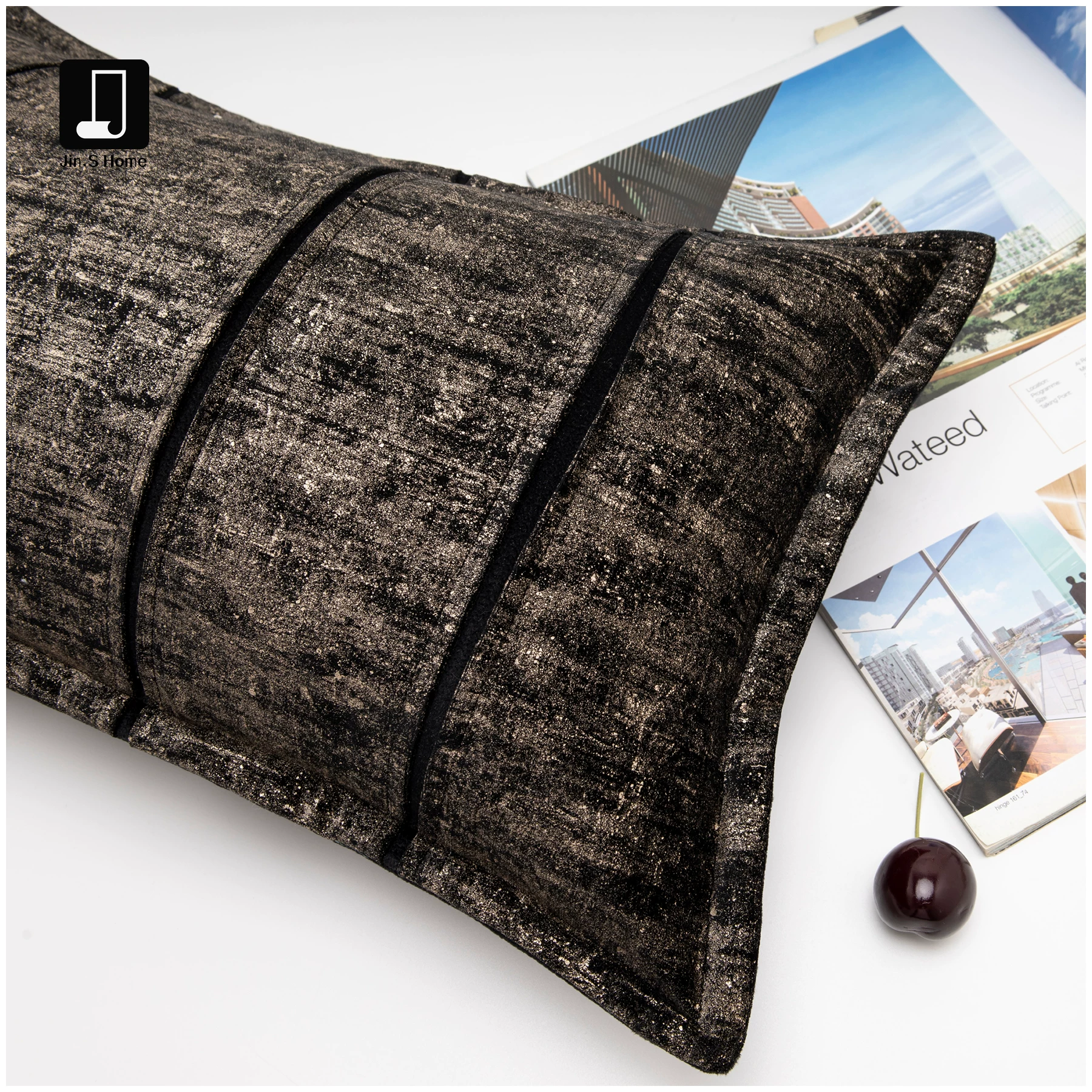 Velvet Cushion with Black and Gold Foil Accents—Light Luxury Living Room Sofa Cushion for Villas, Hotel Showroom, and Bedside Use